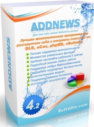Здесь находится превосходная многопоточная программа "AddNews" которая, потребуется для продвижения ваших интернет проектов и рассылки новостей на сайты под управлением популярных движков, таких как DataLife Engine (DLE), PHPBB, vBulletin, UCOZ.